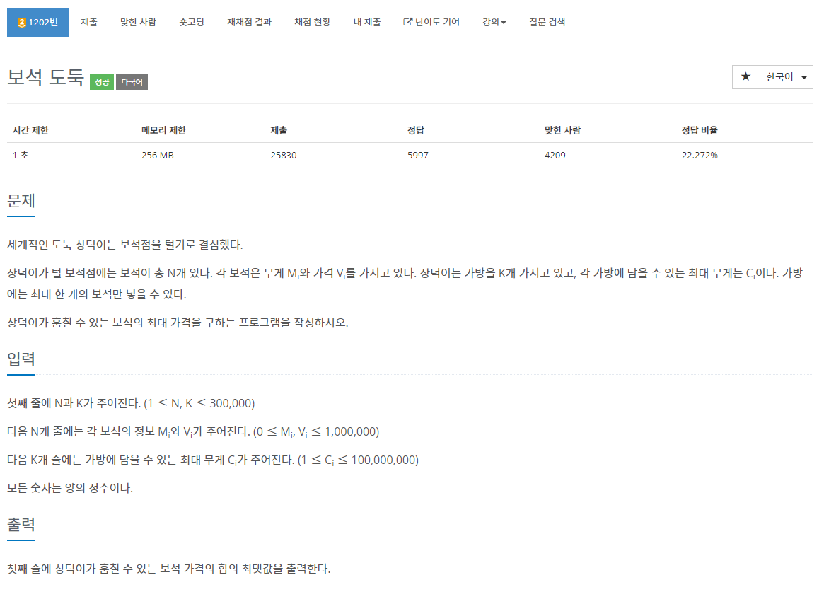 1202번: 보석 도둑