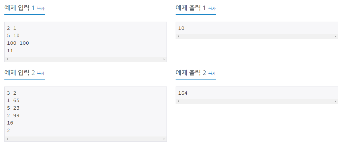 첫째 줄에 N과 K가 주어진다. (1 ≤ N, K ≤ 300,000) 다음 N개 줄에는 각 보석의 정보 Mi와 Vi가 주어진다. (0 ≤ Mi, Vi ≤ 1,000,000) 다음 K개 줄에는 가방에 담을 수 있는 최대 무게 Ci가 주어진다. (1 ≤ Ci