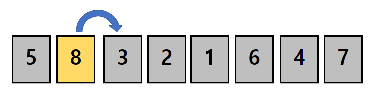 두번째 데이터인 8과 다음 데이터 3을 비교해 더 크다면 둘의 위치를 바꿔줍시다.