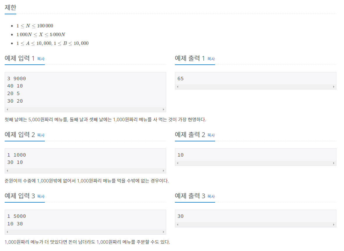 따라서 A메뉴와 B메뉴의 만족도의 차이를 기준으로 입력된 데이터를 정렬해주고, 돈이 허락하는 한에서 A메뉴를 선택했습니다. 돈이 가능한지 여부는 (골라야하는 남은 메뉴의 갯수 * 1000) + 4000 보다 현재 자금이 크거나 같으면 가능하다고 조건문을 잡아두었고 메뉴를 하나 고를때 마다 자금에서 5000원씩을 빼 주었습니다.