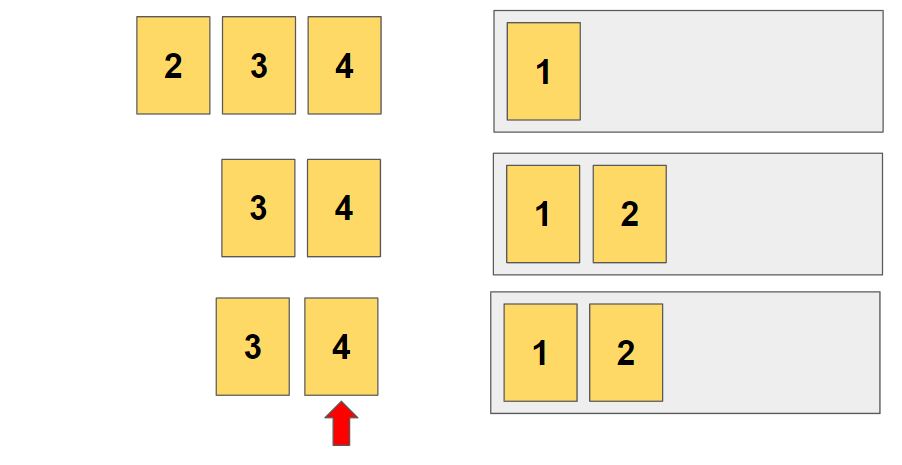원했던 4개의 원소를 뽑았으므로 1-2-3-4 순열이 완성됩니다. (1-2-3 으로 만들수 있는 경우)