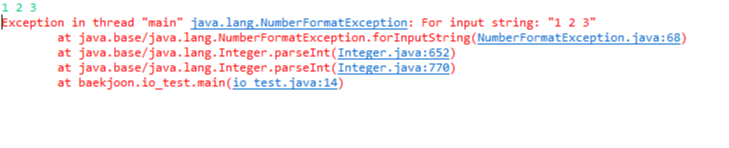 위처럼 StringTokenizer를 사용해서 읽어온 String을 나누어 parsing 해주면, "1 2 3"같은 입력도 원하는 값으로 변환이 가능합니다.