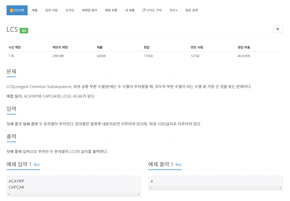 LCS(Longest Common Subsequence, 최장 공통 부분 수열)문제는 두 수열이 주어졌을 때, 모두의 부분 수열이 되는 수열 중 가장 긴 것을 찾는 문제이다. 예를 들어, ACAYKP와 CAPCAK의 LCS는 ACAK가 된다.